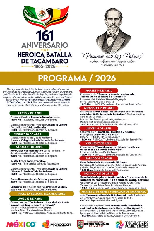 En el marco del 161 Aniversario de la Heroica Batalla de Tacámbaro (1865–2026), el Gobierno Municipal invita a toda la ciudadanía a participar en una serie de actividades cívicas, culturales, académicas y artísticas que honran la memoria, el valor y la identidad de nuestro pueblo.