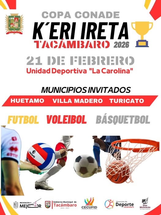 El Gobierno Municipal de Tacámbaro, a través de la Dirección del Deporte, invita a la ciudadanía a ser parte de la Copa CONADE K’eri Ireta Tacámbaro 2026, un evento que reúne el talento, la disciplina y la pasión deportiva de nuestra región.