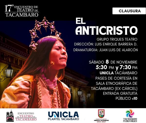 Este sábado 8 de noviembre termina la 17° edición del Encuentro de Teatro de Tacámbaro con la puesta en escena EL ANTICRISTO del Grupo Triques Teatro con dirección de Luis Enrique Barrera D. y dramaturgia de Juan Luis de Alarcón.