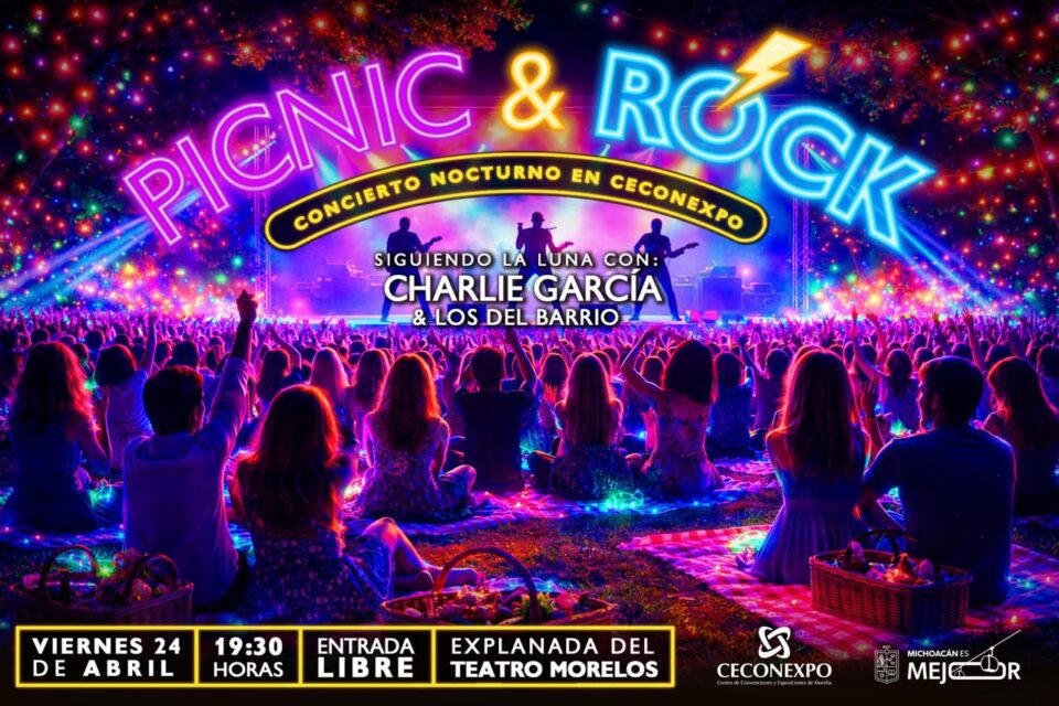 Morelia, Michoacán, 22 de abril de 2026.- El Centro de Convenciones y Exposiciones de Morelia (Ceconexpo) invita al evento “Picnic & Rock: Siguiendo la Luna”, que se realizará el viernes 24 de abril a las 19:30 horas en la explanada del Teatro Morelos, con acceso libre.